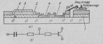 | Рис. 10.3 Гибридная ИС: а – расположение элементов пленочного модуля; б – электрическая схема пленочного модуля: 1, 2, 6 – пленка алюминия; 4, 5 – высокоомная пленка, образующая резисторы; 3 – диэлектрик конденсатора |