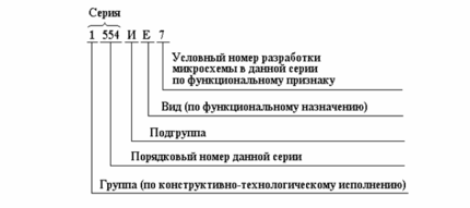 В последнее время при четырехзначном номере серии первую цифру порядкового номера серии устанавливают в зависимости от функционального назначения микросхем, входящих в серию. Например, цифра 0 определяет, что данная серия микросхем предназначена для работы в составе бытовой радиоэлектронной аппаратуры. Цифра 1 ставится на аналоговых микросхемах, цифра 4 - микросхемам ОУ, цифра 5 - цифровым микросхемам, цифра 6 - серии микросхем памяти, цифра 8 - сериям МП.