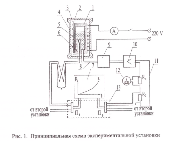 Водяной пар находится в толстостенном сосуде 1, изготовленном из нержавеющей стали. Снаружи сосуд обогревается при помощи электрического нагревателя из нихромовой проволоки 2. Сосуд вместе с нагревателем покрыт асбестовой тепловой изоляцией 3 и помещен в металлический кожух 4. Для измерения температуры пара предусмотрена хромель – алюмелевая термопара 5, горячий спай которой помещен в гильзе 6, вваренной внутрь сосуда, а холодный спай находится в сосуде Дьюара с тающим льдом. ЭДС термопары подаётся через переключатель 12 на двухкоординатный автоматический потенциометр 7, величина ЭДС определяет положение каретки потенциометра на оси абсцисс.