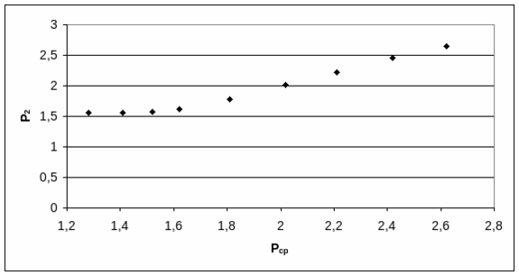 Б) Из графика P2 = f(Pср) находим Ркр как среднее арифметическое значение точек Р2, лежащих на горизонтальной прямой: