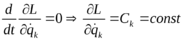 . Таким образом, получен первый интеграл уравнения Лагранжа, соответствующий данной циклической координате qk; поэтому интеграл называют циклическим. Циклический интеграл является линейным относительно обобщённых скоростей. Для полного интегрирования системы уравнений Лагранжа необходимо и достаточно получить 2n первых интегралов этой системы, т. е. 2n соотношений вида:
