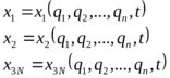 сть некоторая система N точек, на которые наложены голономные связи, выражающиеся несколькими ι уравнениями вида: v(xk, yk, zk,t)=0, (v=1, 2,…,ι). Таким образом, все 3N координат точек системы связаны между собой этими уравнениями. Эти ι уравнений, можно решить относительно каких то переменных, число которых равно ι, таким образом число независимых координат равно n=3N-ι. Перейдём от n независимых декартовых координат к каким то n зависимым обобщённым координатам, т. е. выразим независимые декартовые координаты через n независимых обобщённых координат qi.