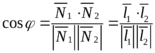 косинус угла между ними может быть найден как косинус угла между их нормалями или направляющими векторами с помощью скалярного произведения: