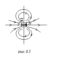 На больших расстояниях от любого распределения тока магнитное поле находится по формуле (8.1), а всё это распределение характеризуется одним вектором, который называется магнитный момент. Кстати, простейший источник магнитного поля это магнитный момент. Для электрического поля простейший источник это монополь, для электрического поля следующий по сложности это электрический диполь, а для магнитного поля всё начинается с этого диполя или магнитного момента. Это, ещё раз обращаю внимание, постольку, поскольку нет этих самых монополей. Был бы монополь, тогда было бы всё также как в электрическом поле. А так у нас простейший источник магнитного поля это магнитный момент, аналог электрического диполя. Наглядный пример магнитного момента – постоянный магнит. Постоянный магнит обладает магнитным моментом, и на большом расстоянии его поле имеет такую структуру: