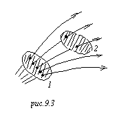 ; если площадка ориентирована так, что нормаль к ней перпендикулярна силовым линиям, то есть магнитное поле скользит по этой поверхности площадки, то поток будет равен нулю. Наглядно величина Ф – это число силовых линий, пересекающих данную площадку. Это число на самом деле зависит от того, как густо мы их нарисуем, но тем не менее эти слова имеют смысл. Имеем однородное магнитное поле. Вот, я возьму площадку 1, тут поток один, теперь я возьму ту же самую площадку, но расположу в точке 2. Здесь (в точке 1) её пересекает пять силовых линий, а здесь (в точке 2) – только две. И, как бы я густо их ни рисовал, картина бы не изменилась.
