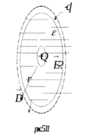 ораль: когда мы решали такую проблему для пустоты, напряжённость поля равнялась, когда шар поместили в диэлектрик, напряжённость поля в раз меньше, чем в пустоте. Легко понять, почему это получается. Когда заряд помещают в диэлектрик, то за счёт поляризации диэлектрика заряд +Q обволакивается отрицательным зарядом -q’, который выступает на поверхности шара.