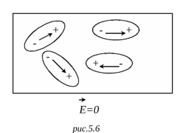 Вот имеем кусок диэлектрика, внешнее поле отсутствует. Дипольные моменты молекул ориентированы хаотически, и в среднем дипольный момент любого элемента объёма равен нулю (рис.5.6).