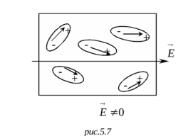 Однако, если мы поместим внешнее электрическое поле, появится преимущественная ориентация, все эти дипольные моменты сориентируются примерно так, как показано на рисунке 5.7. Они не смогут все построиться вдоль поля, потому что хаотическое тепловое движение разрушает структуру, но, по крайней мере, на фоне этого хаоса они будут все стремиться сориентироваться вдоль поля.