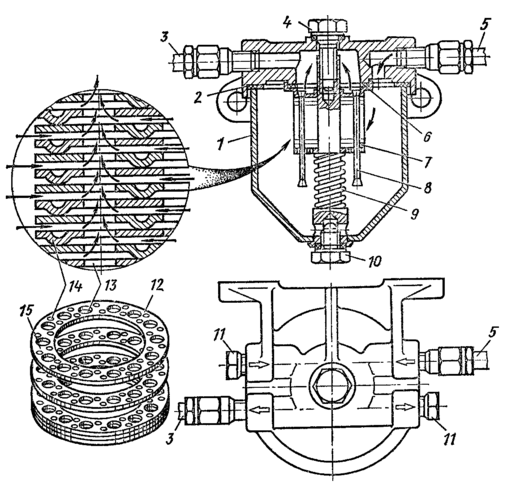 Фильтр тонкой очистки топлива: 1–отверстие для ввода топлива; 2–выходное отверстие; 3–корпус фильтра; 4–прокладка корпуса;