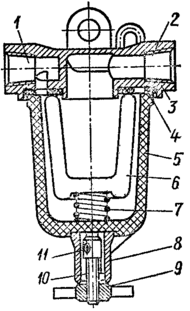 4–болт крышки; 5–топливопровод от топливного бака; 6–прокладка фильтрующего элемента; 7–фильтрующий элемент; 8–стойка фильтрующего элемента; 9–пружина отстойника;