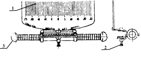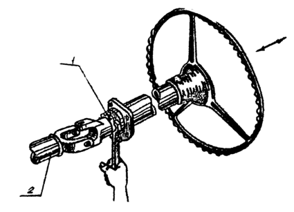 | 1 2 3 4 5 6 | Автомобиль установлен на ровной площадке для движения по прямой. Установить динамометр-люфтомер 3 на рулевом колесе автомобиля и закрепить подвижным зажимом с винтом 2. Стрелку люфтомера закрепить на рулевом колонке с помощью зажимов 1 и 2. Подвижную вилку 6 закрепить винтом 6 посередине. Указатель стрелки 4 отрегулировать по высоте и закрепить винтом 5. Конец стрелки должен располагаться на 3–5 мм выше нулевого деления шкалы 1. Стрелку люфтомера совместить с нулевым делением шкалы 1. При работающем двигателе на малой частоте вращения коленчатого вала повернуть за рукоятку динамометра 3 влево. потом вправо до начала поворота управляемых колёс. По шкале 1 люфтомера определить по общему перемещению угол свободного поворота рулевого колеса. | прибор К-402 | Усилие, прилагаемое к рукоятке. должно быть 1кгс. Угол свободного поворота колеса должен быть 15º. |