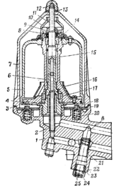 2. 3. 4. | Проверка уровня масла в картере двигателя. В Н Смена масла в картере двигателя. 1) Слить масло из картера двигателя: - пустить и прогреть двигатель до 600С, затем его остановить; - снять крышку заливной горловины, отвернуть сливную пробку поддона картера и слить в посуду отработанное масло, после чего ее завернуть обратно. 2) Залить масло до отметки «В» на указателе уровня масла. 3) Пустить двигатель и дать ему поработать 5 мин. на малой частоте вращения коленчатого вала. 4) Остановить двигатель и через 4-5 мин. долить масло до отметки «В» на указателе уровня масла. Промывка фильтра центробежной очистки масла (рис.1). 1) Отвернуть гайку 12 крепления колпака 7 фильтра и снять колпак. 2) Повернуть ротор 6 вокруг оси 15 так, чтобы стопорные пальцы 18 вошли в отверстия ротора. 3) Отвернуть гайку 11 крепления колпака 5 ротора и снять колпак. 4) Удалить из колпака ротора осадок, промыть детали в дизельном топливе. 5) Собрать фильтр в обратной последовательности, проверив состояние уплотняющей прокладки колпака фильтра. Замена фильтрующих элементов масляного фильтра (рис.2). 1) Отвернуть сливные пробки 11 на колпаках 6 и слить масло. 2) Отвернуть болт 5 крепления колпака фильтра и снять колпак с элементом 4. 3) Вынуть фильтрующий элемент из колпака. 4) Проделать то же со вторым колпаком и промыть оба в дизельном топливе. 5) Заменить фильтрующие элементы и собрать фильтр в обратной последовательности. | Ключ 27х24 Ключ 17х19 Ключ 27х24 Ванна для промывки деталей, лопатка. Ключ 14х17 Ключ 14х17 Ванна для промывки деталей. | Емкость системы смазки двигателя КамАЗ-740 – 21,5 л. Уровень масла проверяется через 4-5 мин., после остановки двигателя, при установке автомобиля на ровной горизонтальной площадке. Уровень масла контролируется по меткам указателя уровня масла, находящегося в задней части двигателя, с правой стороны по ходу движения автомобиля, рядом с маслозаливной горловиной. Перед замером щуп протереть. Уровень должен быть около метки «В», что соответствует требуемому количеству масла в двигателе. В двигателе КамАЗ-740 используется следующие масла: - М8Г2к (зимнее); - М10Г2к (летнее); - М-6З/10В (универсальный всесезонный заменитель). Масло меняется в двигателе при каждом ТО-2 или через 12000 км. Сливая масло из двигателя при смене, обратить внимание, не присутствуют ли в масле вода и металлические частицы. Наличие их указывает на необходимость ремонта двигателя. Масло заливается в двигатель через горловину, расположенную в задней части двигателя справа по ходу движения автомобиля. Необходимо для заполнения масляных полостей в двигателе. Фильтр очистки масла с активным приводом, установлен на передней крышке блока цилиндров справой стороны двигателя. Центробежный фильтр предназначен для дополнительной очистки масла от механических примесей. Обслуживается при выполнении работ ТО-2. Ротор с упорным подшипником 8 снимать со стержня не допускается. Фильтр очистки масла прикреплен тремя болтами к правой стенке блока цилиндров и состоит из двух сменных фильтрующих элементов. В корпусе фильтра встроен перепускной клапан с контактным датчиком. Обслуживается Фильтр при выполнении работ ТО-2. После сборки фильтра проверить, нет ли течи масло в соединениях фильтра на работающем двигателе. При наличии подтекания подтянуть болты колпаков. |