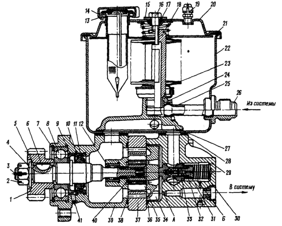 1 — шестерня привода; 2 — гайка крепления шестерни; 3 — шплинт; 4 и 15— шайбы; 5 — вал насоса; 6— сегментная шпонка; 7 и 10 — упорные кольца; 8 — шарикоподшипник; 9 — маслоотгонное кольцо; 11 — манжета; 12 — игольчатый подшипник; 13— пробка заливной горловины; 14— заливной фильтр; 16— болт; 17, 36 и 38 — уплотнительные кольца; 18— труба фильтра;
