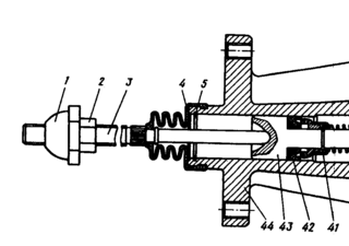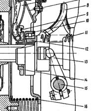| 1. 2. | Проверка и регулировка свободного хода педали сцепления. 1) Проверить величину свободного хода педали сцепления. 2) Отрегулировать зазор между поршнем и толкателем поршня главного цилиндра. Проверка и регулировка свободного хода рычага вилки выключения сцепления. 1) Проверка свободного хода рычага вилки выключения сцепления. 2) Регулировка свободного хода рычага вилки выключения сцепления. | Линейка. Ключ 17 х19. Линейка. Ключ 12х14, 17 х19 | В процессе эксплуатации следует регулировать привод сцепления для обеспечения свободного хода муфты выключения сцепления. Регулировка привода сцепления заключается в проверке и регулировке свободного хода педали сцепления, свободного хода рычага вилки выключения сцепления и проводится при выполнении работ ТО-2. Свободный ход педали, соответствующий началу работы главного цилиндра, должен быть 6…12 мм. Замерять его следует линейкой от пола кабины водителя до педали (средней части ее площадки). Если свободный ход выходит за пределы, указанные выше, необходимо отрегулировать зазор между поршнем и толкателем поршня главного цилиндра. Регулируется (рис. 1) эксцентриковым пальцем 6, который соединяет верхнюю проушину толкателя 7 с рычагом 5 педали. Регулировку проводить при положении, когда оттяжная пружина 8 прижмет педаль сцепления к верхнему упору 4. Провернуть эксцентриковый палец так, чтобы перемещение педали от верхнего упора до момента касания толкателем поршня составило 6…12 мм, затем затянуть и зашплинтовать корончатую гайку. Проверка осуществляется перемещением вручную (рис. 2) рычага 8 вала вилки от регулировочной сферической гайки 10 толкателя 9 пневмоусилителя привода сцепления (при этом необходимо отсоединить пружину от рычага). Величина свободного хода рычага должна составлять 4…5 мм. Свободный ход рычага 8 вилки выключения сцепления регулируется сферической гайкой 10 на конце штока 9. Для регулировки (рис. 3) отвернуть контргайку 2, затем вращением сферической гайки 1 добиваться необходимой величины свободного хода, обеспечивая необходимый зазор (рис. 4) между упорным кольцом 14 рычагов выключения и подшипником 10 муфты выключения сцепления 12. Свободный суммарный ход педали сцепления в результате проведения указанных регулировок должен находиться в пределах 30 – 42 мм. При исправном и правильно отрегулированном приводе управления сцеплением полный ход штока пневмогидравлического усилителя должен быть не менее 25 мм. |