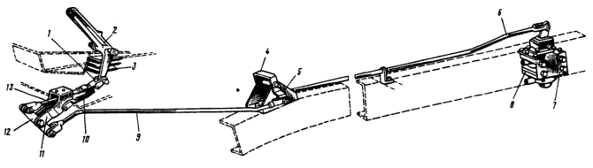 1 — регулировочная вилка с контргайкой; 2 — тормозная педаль; 3 — защитный чехол; 4 — промежуточный рычаг; 5 — промежуточный кронштейн; 6—задняя тяга; 7 — кронштейн тормозного крана; 8 — тормозной кран; 9 — промежуточная тяга: 10 — пружина; 11 — передний кронштейн; 12 — передний рычаг: 13 — тяга педали