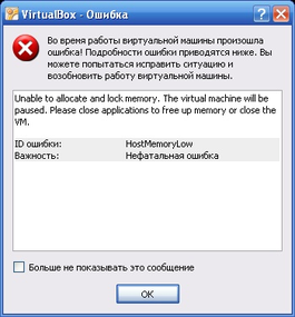 Возникновение этой нефатальной ошибки говорит о недостатке оперативной памяти хост-машины (та система, на которую установлена виртуальная машина)