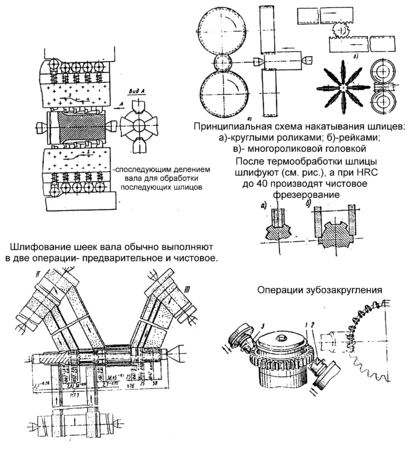 Фрезерование шпоночных пазов производят на шпоночно--фрезерных станках (692А), торцевой или дисковой фрезой. Перспективным является процесс накатывания шлицов (см. рис.) .