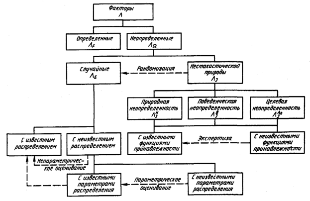 К неопределенным относят переменные, о значениях которых в реальном процессе исследователь осведомлен не полностью. Природа неопределенности этих переменных (факторов) может быть различной. Обычно неопределенные переменные делят на две группы: случайные переменные