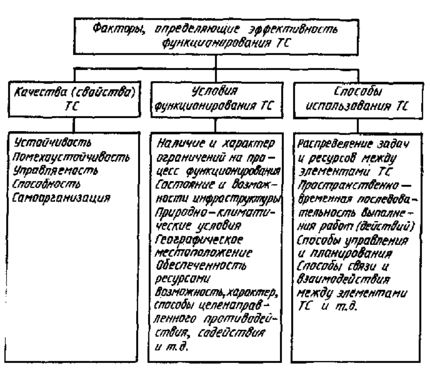 При исследовании эффективности технических систем, как правило, выделяют три группы факторов: качество (свойства) ТС, условия функционирования ТС, способы использования (применения) ТС.