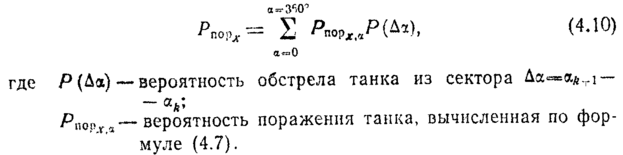 Вероятность поражения танка в конкретных условиях одним выстрелом выбранного средства поражения определяется по приведенной ранее формуле (4.6). Для того чтобы вычислить вероятность поражения, обобщенную по всем условиям обстрела, то есть по противотанковым средствам противника, направлениям и дальностям, с которых возможен обстрел танка, а также учесть экранирующие свойства местности, необходимо дополнить формулу (4.6). Формула вероятности поражения танка одним «обобщенным» выстрелом примет вид