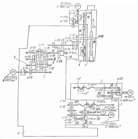 Главное движение. Шпиндель VIII получает вращение от асинхронного электродвигателя M1 (N = 7,5 кВт, n = 1450 об/мин) через коробку скоростей с тремя передвижными блоками зубчатых колес Б1, Б2, БЗ и передачи z = 39–39, z = 42–41–42 в шпиндельной головке. Механизм переключения блоков обеспечивает получение 18 частот вращения и позволяет выбирать требуемую частоту вращения без последовательного прохождения промежуточных ступеней. Уравнение кинематической цепи для минимальной частоты вращения шпинделя