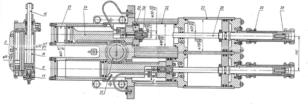 В корпусе 19 запрессована бронзовая втулка 20, которая является направляющей штока 11. На штоке жестко закреплен хомут 5, к которому крепится штанга 6 с двумя упорами 7 и 12, предназначенными для ограничения хода штока. Передвигая упоры по штанге, можно регулировать ход руки. Положение упоров фиксируется винтами 21. Штанга 6 одновременно служит для удержания шток-поршня 11 от проворота относительно продольной оси руки.