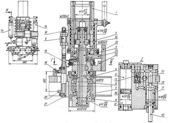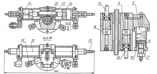 отверстие, образованное коническим хвостовиком золотника и сверлением в корпусе. При перемещении золотника сечение отверстия уменьшается, плавно увеличивая сопротивление движению руки: происходит торможение руки. Эффективность (время) торможения можно регулировать дросселем. Масло, вытесненное при движении золотника 32, частично перетекает в полость К и перемещает поршень 30 в правую сторону, преодолевая давление постоянно подаваемого через штуцер 31 воздуха.