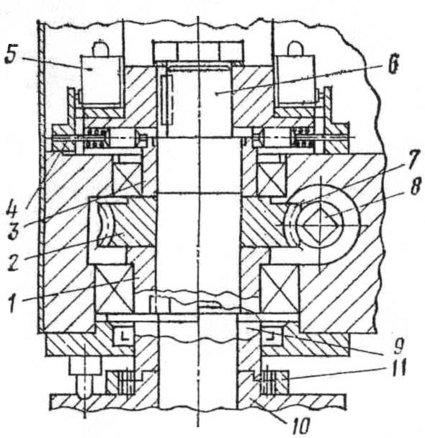 Рассмотрим принцип работы командоаппарата резцедержателя (рис. 3). Микропереключатели 5 срабатывают при совпадении толкателей 4 с лунками на втулке 3 при ее вращении вокруг оси 6 резцедержателя. Гильза 1 получает вращение от электродвигателя через зубчатую пару (на схеме не показана) и червячную пару 7 и 2. Гильза 1 в нижней части выполнена в виде двухзубой торцовой муфты, сопрягающейся с другой торцовой муфтой 9, имеющей зубчатый венец. Такой венец имеет втулка 10, соединенная шпонкой с корпусом резцедержателя. Таким образом, через эти венцы с помощью кольца 11 с внутренним зубчатым венцом движение поворота передается корпусу резцедержателя (на схеме не показан).