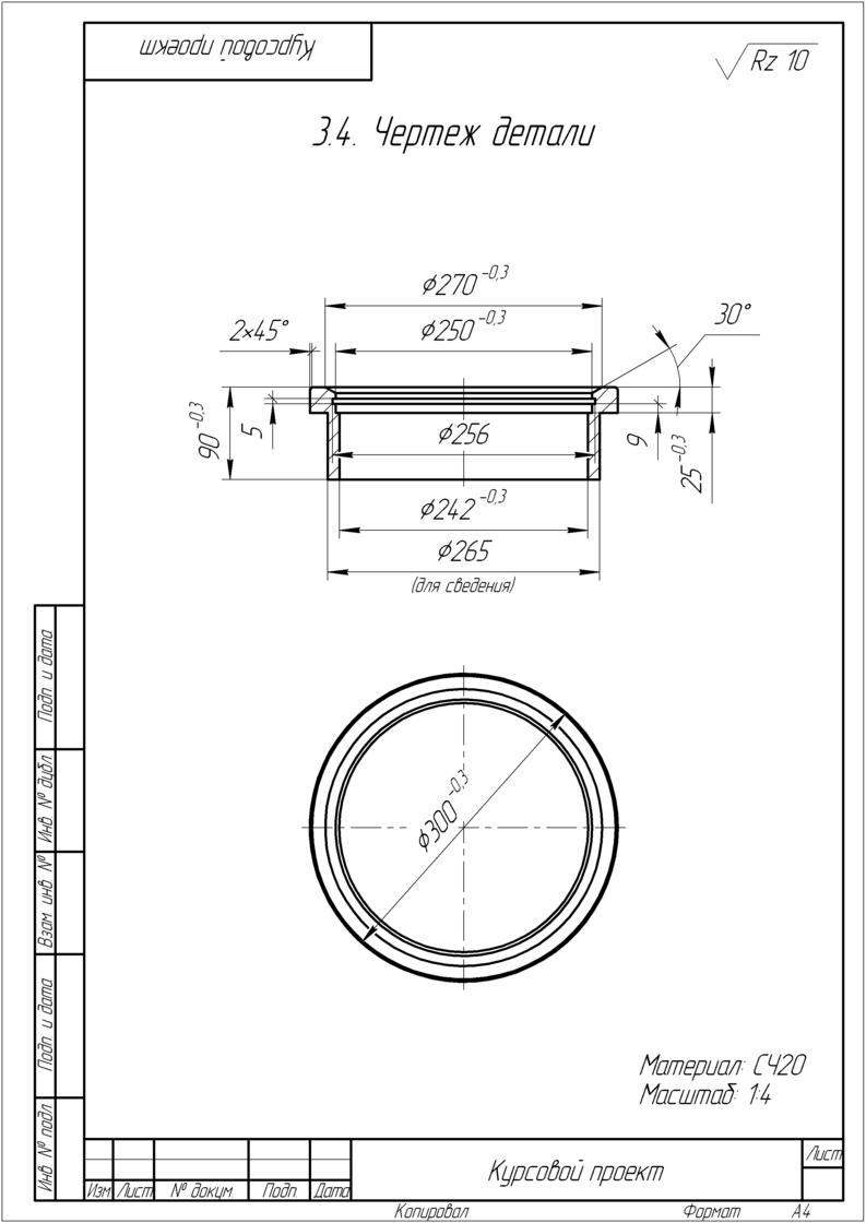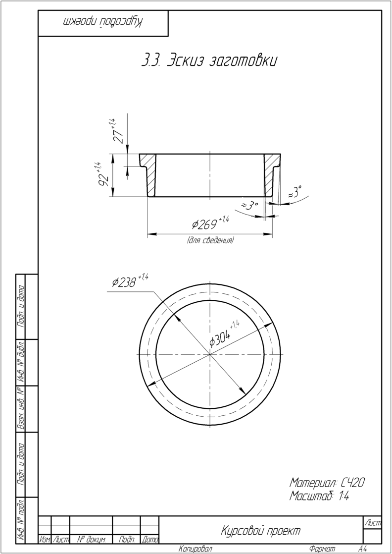 Поскольку материал обрабатываемой детали – серый чугун (СЧ20), выберем литье в песчаную форму как способ получения заготовки. При отливке заготовка получает некоторые уклоны (≈3°) и припуски (2–4 мм), однако выбранный способ более экономичен в данном случае и не требует сложных операций.
