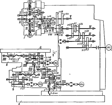 Кинематика станка. Главное движение. Шпиндель VIII получает вращение от асинхронного электродвигателя Ml (N = — 7,5 кВт, п = 1460 об/мин) через коробку скоростей с тремя передвижными блоками зубчатых колес Б1, Б2, БЗ и передачи г = 39—39, 48—48 в шпиндельной головке. Переключение двух тройных блоков Б1 и Б2 и двойного блока БЗ обеспечивает 18 значений частот вращений шпинделя в пределах 40—2000 об/мин. 146