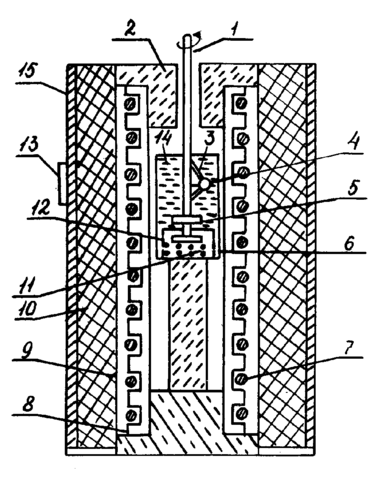 ис. 11.1.2.13. Установка для выращивания монокристаллов на затравку: 1 - вал мешалки; 2 - огнеупорный кирпич; 3 - держатель (Pt), 4- затравка; 5 - мешалка ( Pt ); 6 - тигель (Pt ); 7 - нагреватель; 8 - аллундовая трубка с канавкой на поверхности; 9 - алундовый цемент; 10 - изоляция; 11 - шихта; 12 - перегородка; 13-зонa роста; 14 - расплав растворителя; 15 - металлический кожух