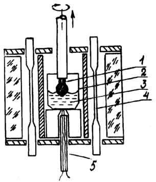 ис. 11.1.2.14. Схема кристаллизационной установки для выращивания кристаллов из раствора в расплаве на затравку:1 - растущий кристалл;2 - тигель; 3 - раствор; 4 - нагреватель; 5 - термопара