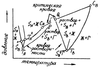 В - нелетучее вещество, ограниченно растворимое в растворителе: ТA - тройная точка чистого компонента А; Т΄A - тройная точка компонента А, содержащего растворенный компонент В; ТВ тройная точка компонента В; СA и СB - критические точки компонентов А и В.