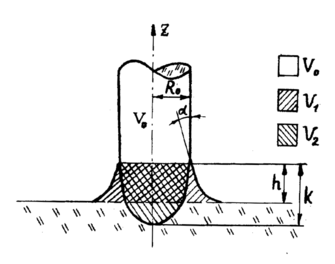 Смысл величин V0, V1, V2 явствует из рисунка 11.1.6, где m0 — постоянная масса держателя кристалла, и, в зависимости от расположения датчика веса, некоторой части штока (при взвешивании кристалла) или масса некоторой части кристаллизатора (при взвешивании тигля с расплавом); g — ускорение силы тяжести; σ - поверхностное натяжение расплава; ρs - плотность кристалла; ρL - плотность расплава; R0 - радиус растущего кристалла в стационарных условиях.
