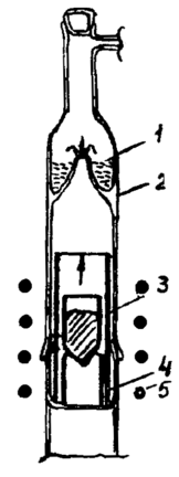 ис. 11.1.21. Схема реактора для выращивания кристаллов сульфидных редких земель в атмосфере паров серы; 1 - затвор, 2 - кварцевый реактор; 3 - тигель с сульфидом; 4 - тепловой экран; 5 - ВЧ индуктор