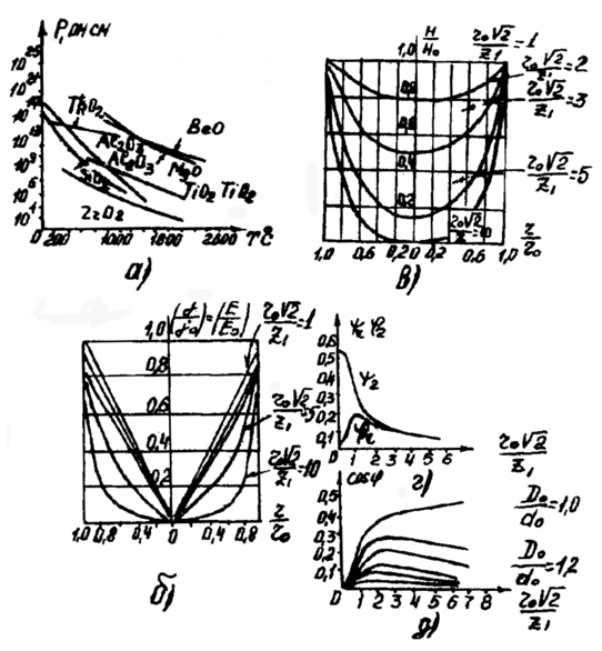 а - зависимость удельного сопротивления оксидных монокристаллов от температуры; б — зависимость модуля напряженности электрического поля и пропорционального ему модуля настила тока от аргумента r0 21/2/z1; в - зависимость модуля напряженности магнитного поля от аргумента r0 21/2/z1; г - зависимость функций ψ2 и φ4 от аргумента r0 21/2/z1; д- зависимость cosφ системы индуктор-расплав от аргумента r0 21/2/z1 и отношения D0/d0