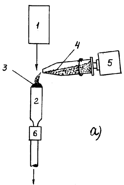 ис. 11.1.26 а. Схемы кристаллизационных аппаратов с лазерным нагревом по методу Вернейля: 1 — лазер; 2 - кристалл; 3 - расплав; 4 - шихта; 5 -двигатель; 6 – механизм опускания.