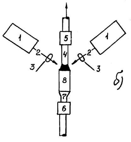 Рис. 11.1.26 б. Схемы кристаллизационных аппаратов с лазерным нагревом по методу Чохральского: 1 - лазер; 2 - луч; 3 - фокусирующая линза;4 -растущий кристалл; 5 - верхний механизм перемещения; 6 механизм перемещения; 7 - цанговый держатель; 8 –штабик