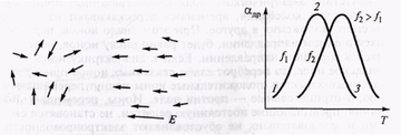 Дипольно-релаксационная поляризация заключается в том, что под действием внешнего электрического поля становится более упорядоченным положение полярных молекул (диполей), непрерывно совершающих хаотическое тепловое движение (рис. 2.9). Этот вид поляризации зависит от температуры и частоты приложенного напряжения. С повышением температуры в результате ослабления молекулярных связей увеличивается ориентация диполей в направлении электрического поля, поэтому дипольно-релаксационная поляризуемость α др возрастает (рис. 2.10, участок 1-2). Однако с повышением температуры возрастает и энергия хаотического теплового движения диполей, и выше некоторой температуры Тм дезориентирующее действие теплового движения начинает преобладать над ориентирующим действием электрического поля. Поэтому при дальнейшем нагревании (при Т> Тм) дипольно-релаксационная поляризуемость αдр уменьшается (участок 2-3). Таким образом, при нагревании αдр возрастает, проходит через температурный максимум и далее понижается.