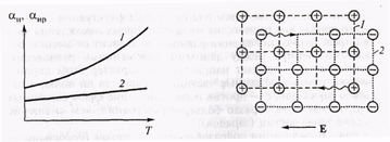 Ионная поляризация наблюдается в кристаллических и аморфных телах ионного строения (в кварце, слюде, асбесте, стекле и т.п.) и заключается в смещении упруго связанных ионов под действием приложенного поля на расстояния, меньшие постоянной решетки, т.е. в упругой деформации решетки (у аморфных веществ — апериодической сетки). На рис. 2.6 схематически показана ионная поляризация NaCl, имеющего кубическую решетку. Время установления ионной поляризации порядка 10-12— 10-13 c , поэтому она имеет место на всех частотах до оптических включительно. Ионная поляризуемость αи не зависит от частоты приложенного напряжения, но с повышением температуры линейно возрастает (рис. 2.7, 2), так как происходит ослабление упругой связи между ионами; αи = 2q/kсв , где q — заряд иона; kсв — коэффициент упругой связи между ионами. Чем слабее связь между ионами и чем выше их заряд (валентность), тем больше αэ.