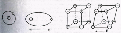 Электронная поляризация - упругое смещение (деформации) электронных оболочек атомов (ионов) относительно ядра (рис. 2.5) и имеет место во всех диэлектриках. Время установления этой поляризации чрезвычайно мало (τ = 10-14—10-15 с), поэтому она наблюдается на всех частотах, включая оптические (τ = 1012 —1015 Гц). Электронная поляризуемость αэ не зависит от температуры и частоты приложенного напряжения (αэ ≠ φ(T,f)), а с увеличением размера атома (иона) возрастает; αэ = r3, где r — радиус атома (иона).