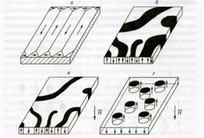 Для создания функциональных устройств наиболее перспективны ферриты в виде пленок. Специфика магнитных свойств тонких пленок определяется тем, что их линейные размеры в плоскости пленки значительно превышают толщину. При определенной толщине пленка становится однодоменной по толщине. В этом случае основным процессом перемагничивания будет однородное вращение, когда магнитные моменты одновременно поворачиваются по магнитному полю. Длительность этого процесса очень мала ~ 10-9 с, что обеспечивает создание быстродействующих магнитных устройств. Магнитные пленки характеризуются также ярко выраженной магнитной анизотропией, которая определяется наличием в магнитной пленке двух осей намагничивания: ось легкого намагничивания, вдоль которой стремится установиться вектор намагничивания пленки, и ось трудного намагничивания, направленная перпендикулярно первой оси. Соответственно при перемагничивании по оси легкого намагничивания необходимо затратить существенно меньшую энергию, чем при перемагничивании по оси трудного намагничивания. Энергия WA, которую необходимо затратить, чтобы отклонить вектор намагниченности в плоскости пленки на угол θ от оси легкого намагничивания, определяется выражением WA = Asin2Q, где А — константа анизотропии. При малой толщине пленок направление легкого намагничивания обычно расположено в плоскости пленок, и образуются так называемые плоские домены, условно изображенные на рис. 2.15, а; ширина доменов изменяется от долей до единиц микрон.