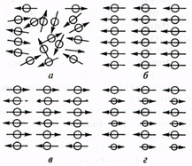 Pис. 14.1. Схематическое изображение магнитных моментов атомов в отсутствие внешнего магнитного поля в парамагнетиках (а), ферромагнетиках (б), антиферромагнетиках (в) и ферримагнетиках(г)