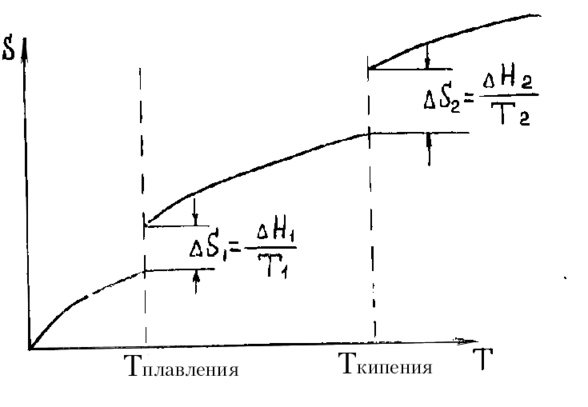 S = f(T), где H1 и H2— энтальпии плавления и кипения при Т1 и Т2 соответственно. При абсолютном нуле S=0. Усложнение строения частиц системы приводит к росту энтропии, так как число возможностей для изменения энергии увеличивается.