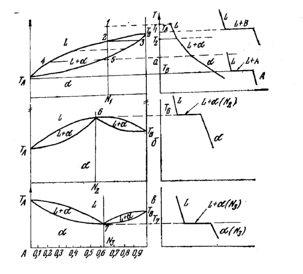 ис. 1.5.2. Кривые охлаждения и типы диаграмм состояний компонентов, полностью растворимых друг в друге в твердом и жидком состояниях.