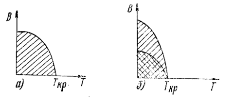 огласно термодинамической теории сверхпроводимости, сверхпроводящее и несверхпроводящее («нормальное») состояния являются двумя фазами вещества, переходящими одна в другую при определенных значениях параметров состояния— температуры Ткр и напряженности магнитного поля. Значение величины магнитной индукции, при которой происходит переход материала из сверхпроводящего в нормальное состояние, называют критической и обозначают Вкр. По характеру перехода различают сверхпроводники первого и второго рода, фазовые диаграммы которых приведены на рис. 3.3, а, б соответственно. Кривая, отделяющая область сверхпроводящего состояния от несверхпроводящего, называется граничной кривой.