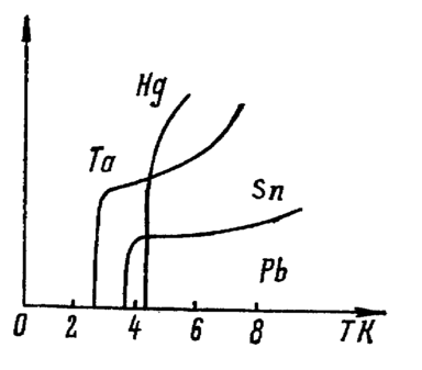 Температуры перехода сверхпроводников в сверхпроводящее состояние низки. Так, например, для некоторых чистых металлов значения их лежат в пределах от 0,35 К (гафний) до 9,2 К (ниобий); для сплавов —от 0,155К. (ВiРt) до 18К (Nb3Sn).