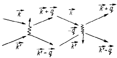 бразование электронных пар можно объяснить квантовомеханически с помощью обменных взаимодействий. Электрон-электронное взаимодействие посредством обмена фононом (виртуальным) показано па диаграмме рис. 5.2.2, где рассмотрены две равносильные возможности: переход виртуального фонона q от электрона k' к электрону k.'