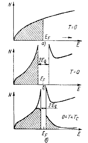 ис.5.2.3 Плотность состояний свободных электронов (а) и неспаренных электронов в сверхпроводящем состоянии (б,в)