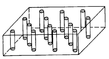 Картина разрушения сверхпроводимости магнитным полем в сверхпроводниках II рода подробно рассмотрена Абрикосовым. В смешанном состоянии СП как бы пронизан нитями (рис. 5.2.15). Нить представляет собой тонкую область нормальной фазы, ориентированной вдоль вектора В. Причем каждой нити соответствует ровно один квант магнитного потока.